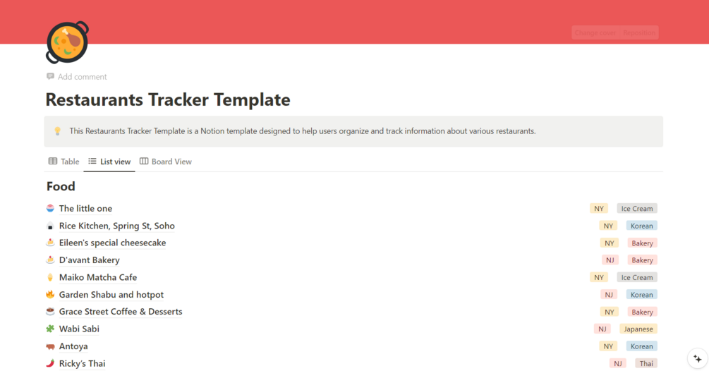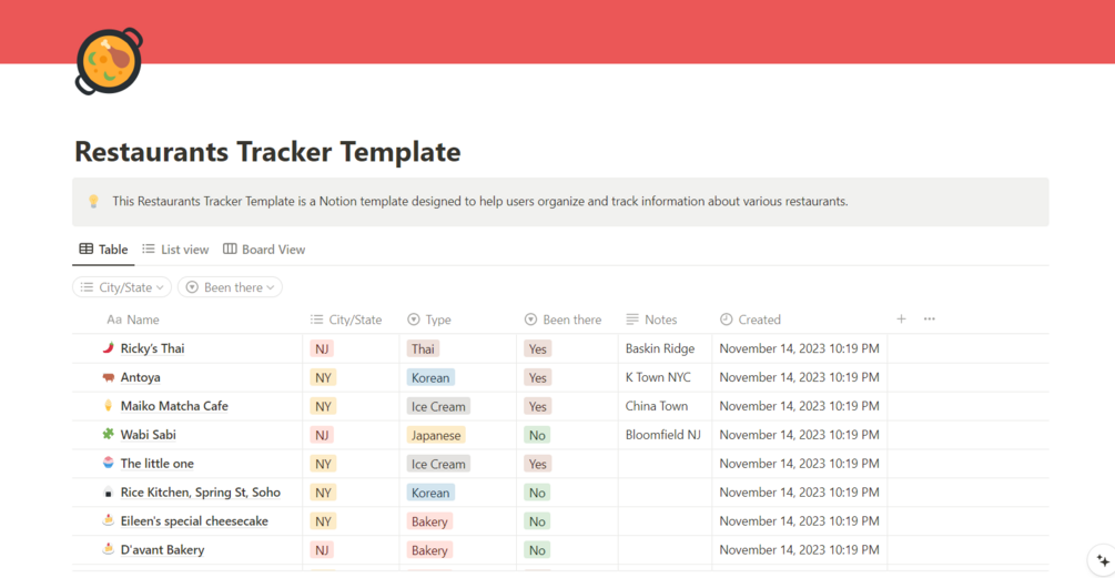 This Restaurants Tracker Template is a Notion template designed to help users organize and track information about various restaurants.